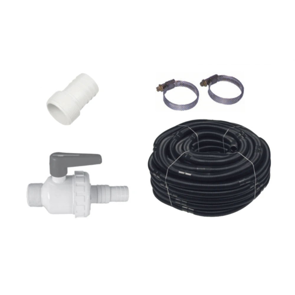 Namelijk twee korte buizen en de filtratie set. Met deze aansluitset vergroot je de mogelijkheden en kan je de installatie vergemakkelijken. De set bestaat uit 15 meter flexibele buis waarmee je de filterpomp wat verder van het zwembad kan plaatsen. Ook zitten er 2 kranen bij die dichtgezet kunnen worden zodat je de filterpomp kunt openen zonder leeg lopen van het bad. In dit pakket zitten 5 RVS klemmen voor het monteren van de slang. 2 rollen teflon voor het afdichten van de stukken met schroefdraad. Tot slot heb je nog 3 slangenpilaren die vertrekken uit schroefdraad 1″ 1/2 naar 38 mm. Deze onderdelen zijn van goeie kwaliteit afkomstig van het merk praher plastics.