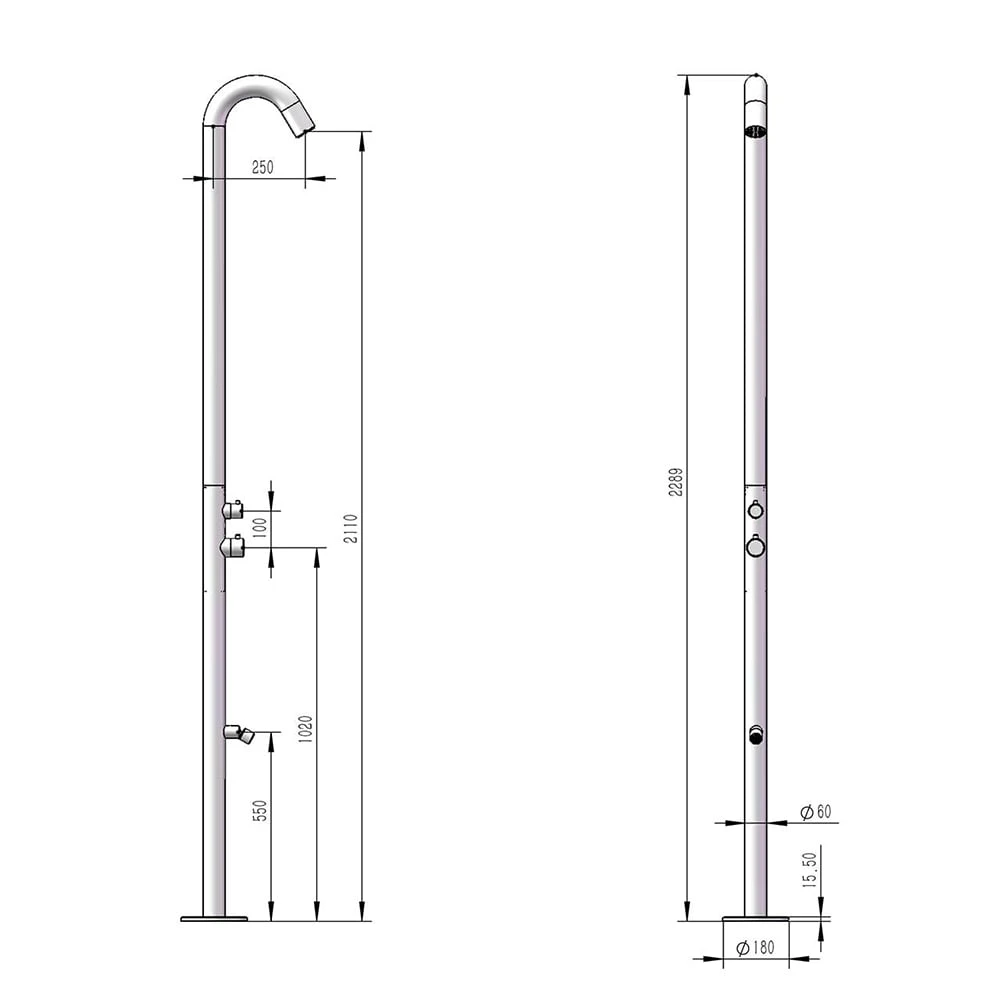 Deze designdouche is zorgvuldig uitgekozen door ons team van ervaringsdeskundigen. Ze is gemaakt uit RVS met een matzwarte poedercoating. Mede dankzij zijn technisch vernuftig systeem is de douche zeer eenvoudig te plaatsen. Ook in de winter kan je zeer eenvoudig afkoppelen. Er is een montage blokje voorzien waar de sanitaire leidingen op aangesloten worden.