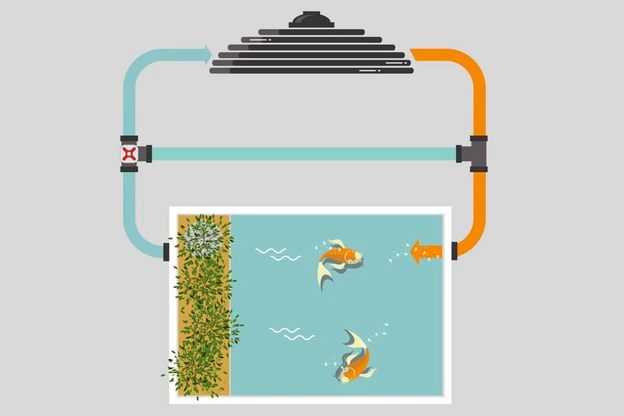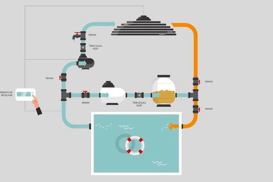 De pomp stuurt het zwembadwater rechtstreeks door de zonnecollectoren.