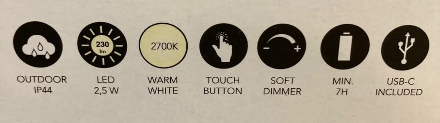 - De outdoor tafellamp is traploos dimbaar. Wanneer u de touch button blijft aanraken zal de lamp dimmen of oplichten