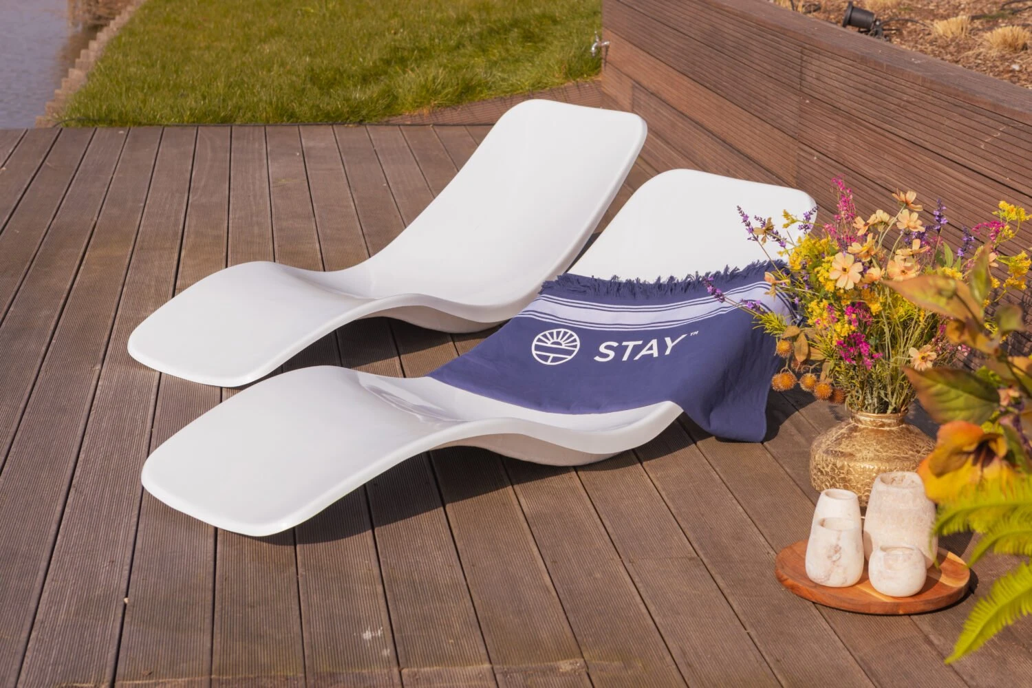 Design Luxe lounge ligbed voor in het water, vervaardigd uit galsvezel. In het zitvlak zit een minuscuul gaatje waardoor het ligbed mooi zinkt naar de bodem.