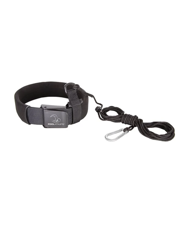 Het touw dat u vastmaakt rond uw middel is 4m lang. De pooltrainer plaatst u best OP de boordsteen of net er na op een maxiale afstand van 1m van de rand van het zwembad.