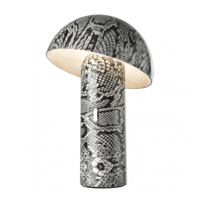 Svamp design tafellamp met kantelbare kop. Sfeerlamp in verschillende kleuren & prints vr gebruik binnen op een tafel of kast als sfeerlamp. Zeer mooie designlamp in kunststof, verkrijgbaar in zwart, wit, grijs of een print in carbon, snake of panter. Eenvoudig te bedienen, lange brand tijd tot 24H in de minst sterke lichtstand.